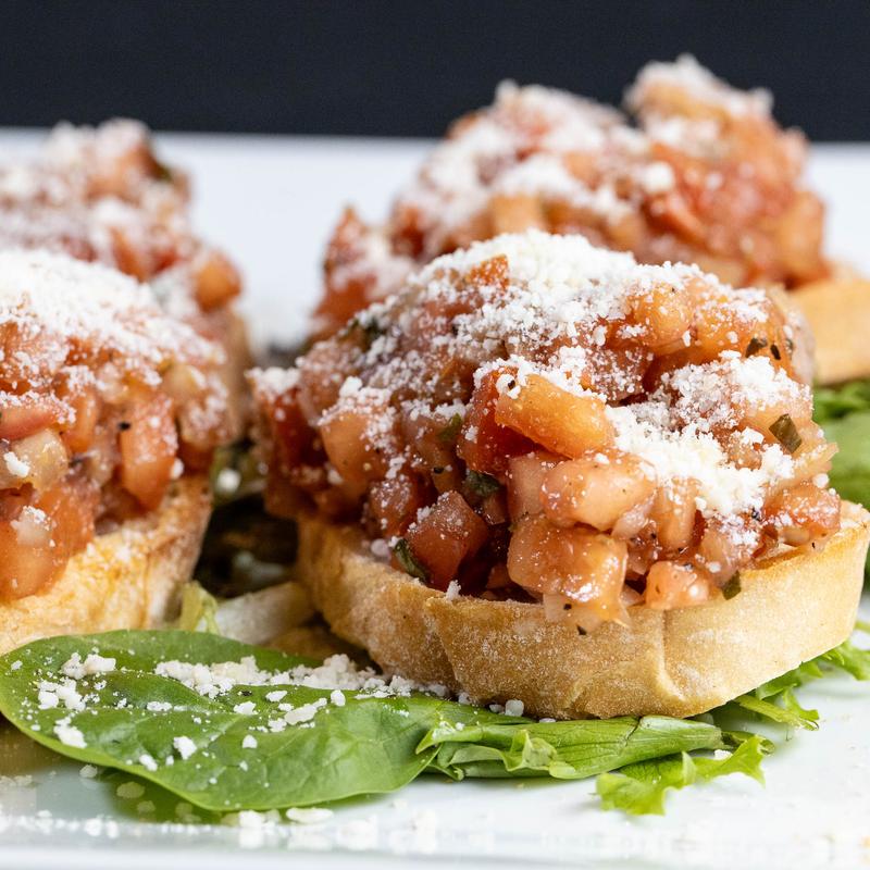 Seasoned, breaded chicken cutlet served with mesclun spring greens, topped with tomato bruschetta and Pecorino Romano, dressed with a touch of olive oil and balsamic vinegar.