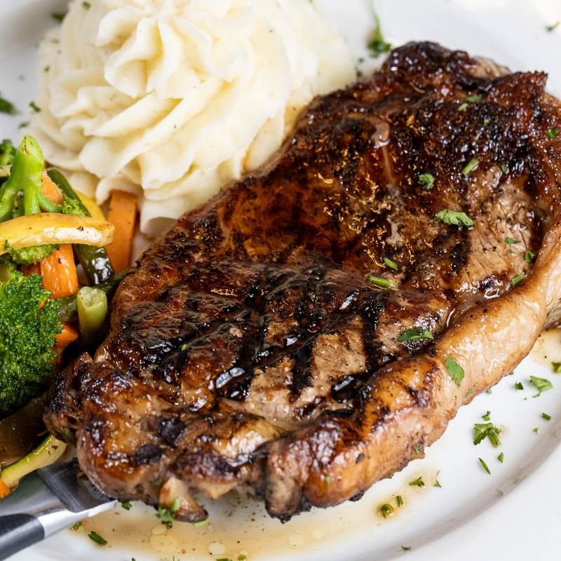 Rib-eye steak served with mashed potatoes and mixed vegetables.
